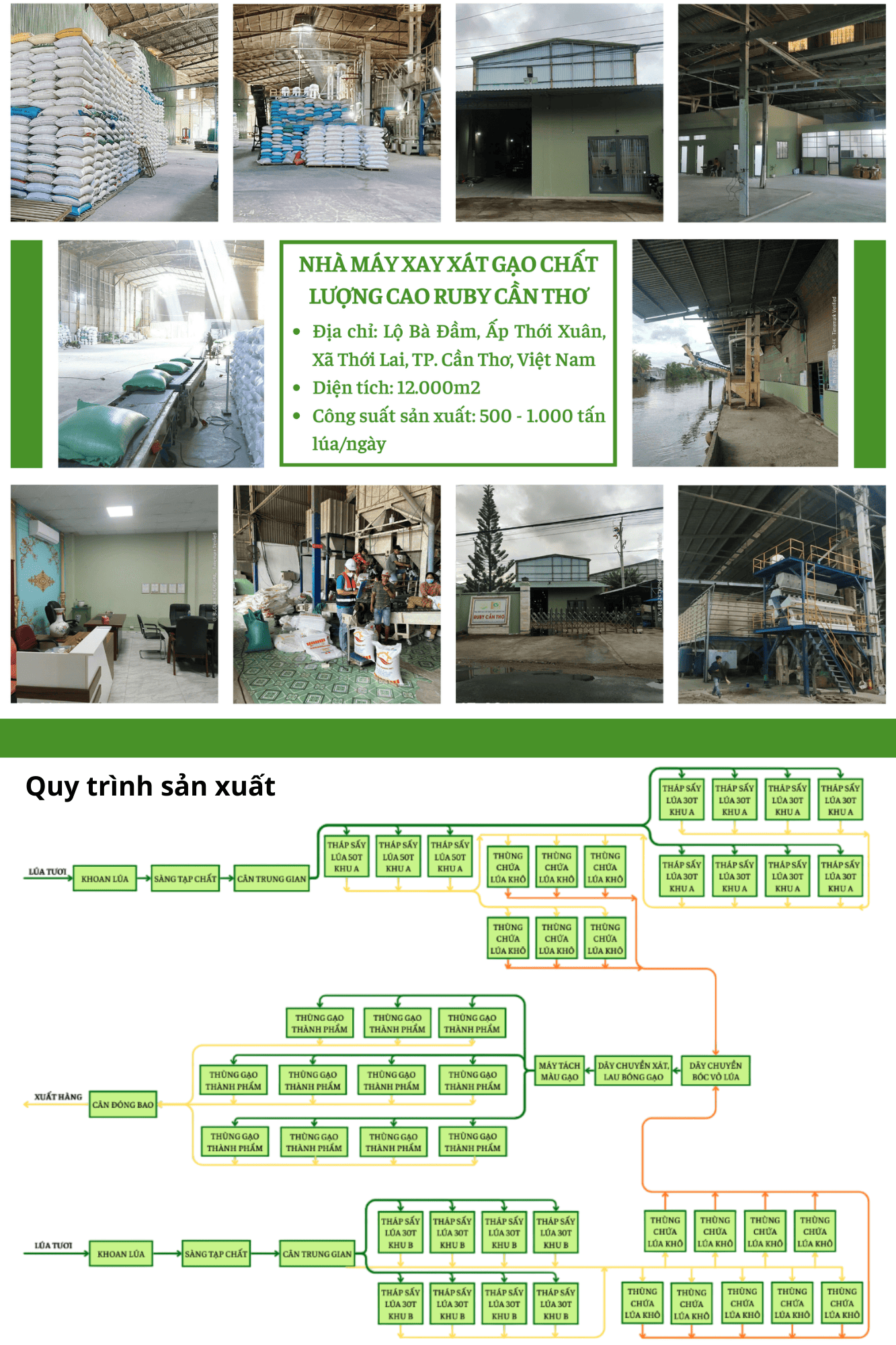 Đồng Xanh Mekong đã xây dựng một hệ thống nhà máy hiện đại, đầu tư máy móc thiết bị kỹ thuật nhập khẩu, vận hành theo dây chuyền công nghệ tiên tiến, nâng cao năng lực sản xuất. Với đầy đủ các trang thiết bị từ lò sấy, thùng chứa lúa khô, dây chuyền máy bóc vỏ, dây duyền lau máy, dây chuyền tách màu và kho chứa lúa số lượng lớn. Đồng Xanh Mekong khẳng định có thể đáp ứng nhu cầu mua hàng số lượng lớn của khách hàng, cũng như đảm bảo về mặt chất lượng sản phẩm.